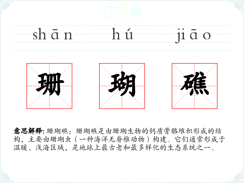 - 反义词:无(珊瑚礁是一个特定的生态结构,没有直接的反义词)