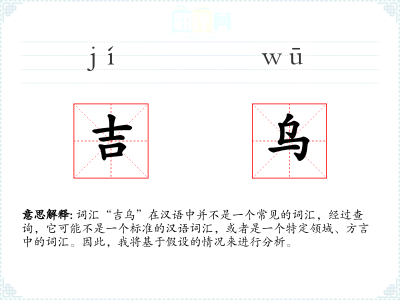 假设“吉乌”是一个汉语词汇,它的字面意思可能是“吉祥的乌鸦”。在汉语中,“吉”通常表示吉祥、好运,而“乌”则指乌鸦。乌鸦在不同的文化中有着不同的象征意义,有的文化中认为乌鸦是不祥之鸟,而在有的文化中则认为乌鸦是智慧的象征。