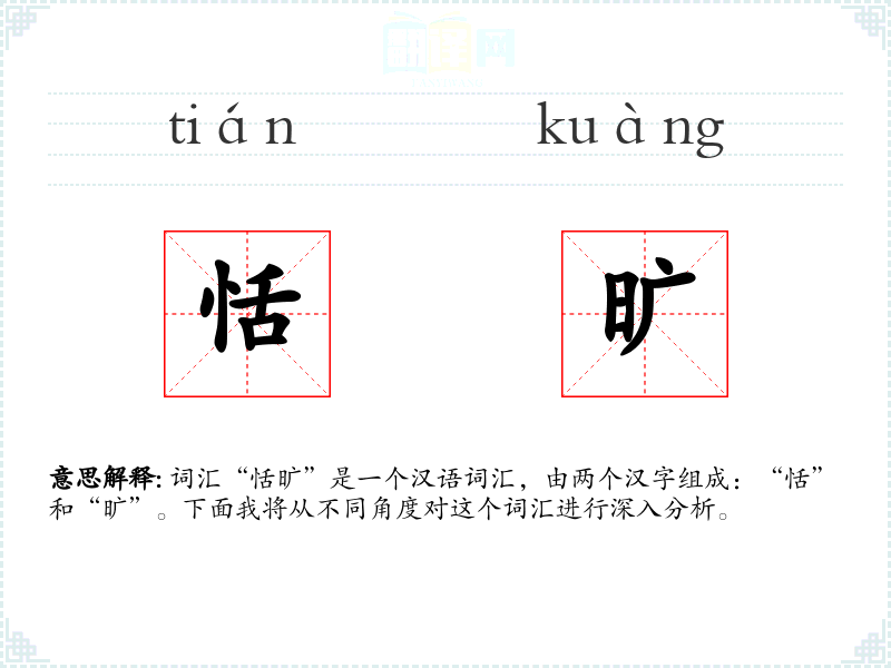 - 词源:“恬”字最早见于《说文解字》,“旷”字则在《诗经》中已有使用。