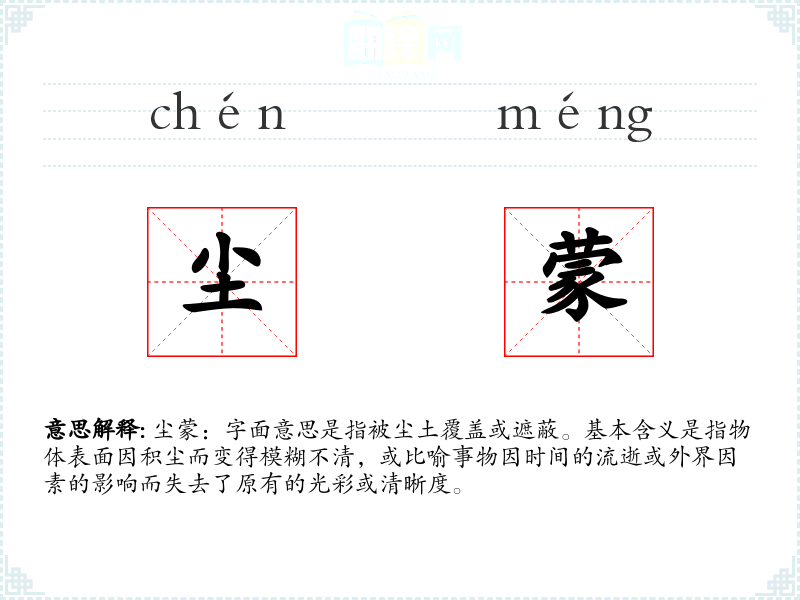 “尘蒙”由两个汉字组成,“尘”指尘土,“蒙”指覆盖或遮蔽。在古代汉语中,“蒙”已有遮蔽的含义,如“蒙蔽”。随着语言的发展,“尘蒙”逐渐被用来形容物体表面的尘土覆盖。