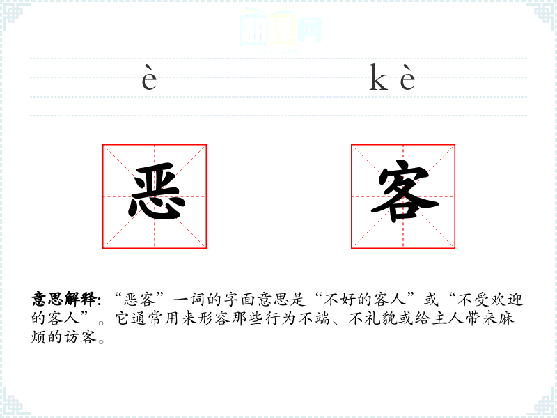 “恶客”一词的字面意思是“不好的客人”或“不受欢迎的客人”。它通常用来形容那些行为不端、不礼貌或给主人带来麻烦的访客。