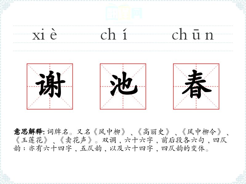 词牌名。又名《风中柳》﹑《高丽史》﹑《风中柳令》﹑《玉莲花》﹑《卖花声》。双调﹐六十六字﹐前后段各六句﹐四仄韵﹔亦有六十四字﹐五仄韵﹐以及六十四字﹐四仄韵的变体。