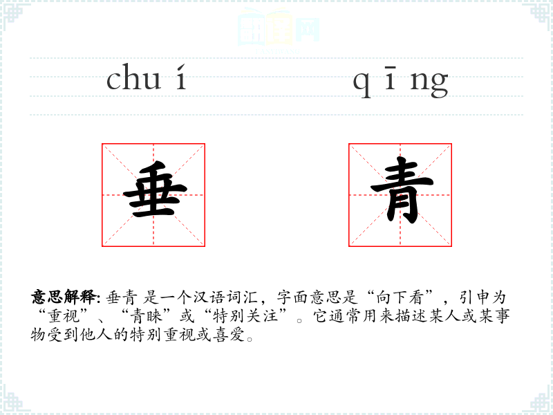 垂青 是一个汉语词汇,字面意思是“向下看”,引申为“重视”、“青睐”或“特别关注”。它通常用来描述某人或某事物受到他人的特别重视或喜爱。