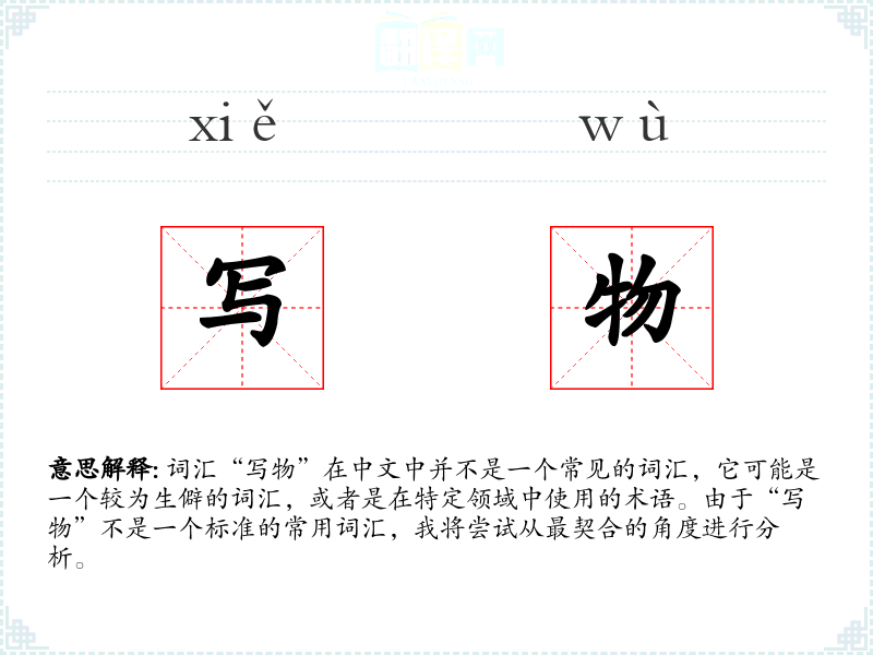 由于“写物”不是一个常用词汇,其词源和演变可能不为人所熟知。它可能是由“写”(书写、描绘)和“物”(物体、物品)两个字组合而成。