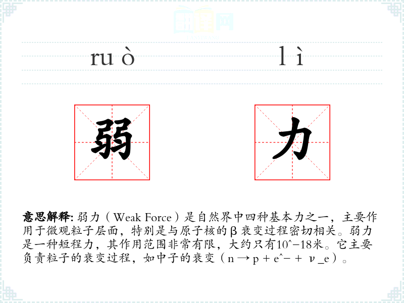 在物理学和粒子物理学中,弱力是一个专业术语,用于描述特定类型的粒子相互作用。在文学和口语中,这个词可能不太常见,除非是在讨论科学话题时。在科普文章或教育材料中,弱力可能会被用来解释原子核的结构和粒子的行为。