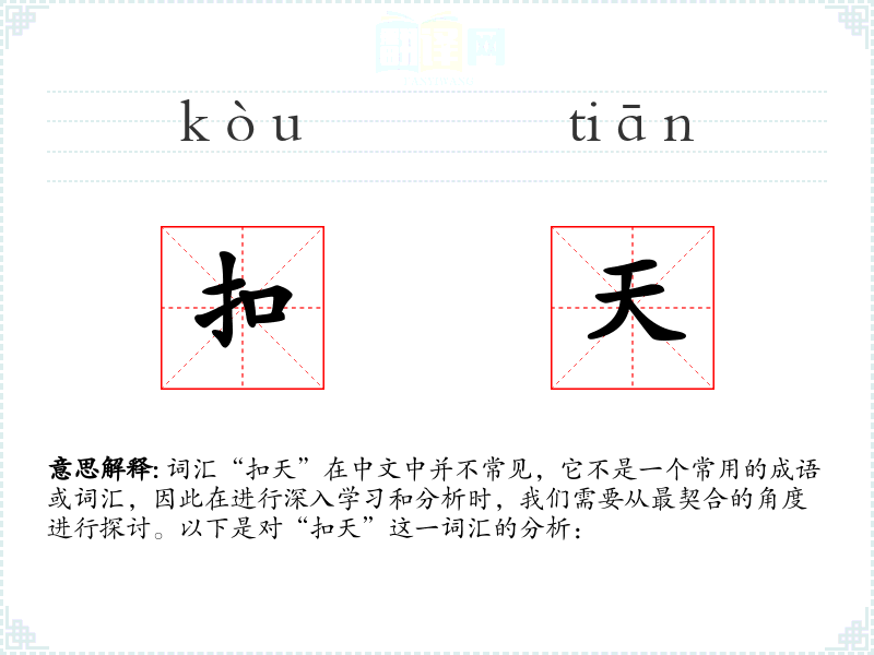 词汇“扣天”在中文中并不常见,它不是一个常用的成语或词汇,因此在进行深入学*和分析时,我们需要从最契合的角度进行探讨。以下是对“扣天”这一词汇的分析: