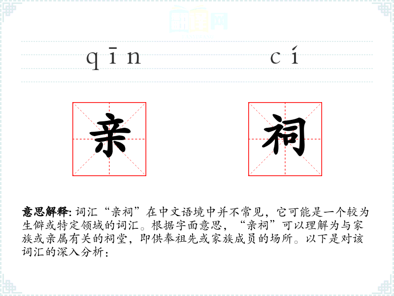 词汇“亲祠”在中文语境中并不常见,它可能是一个较为生僻或特定领域的词汇。根据字面意思,“亲祠”可以理解为与家族或亲属有关的祠堂,即供奉祖先或家族成员的场所。以下是对该词汇的深入分析: