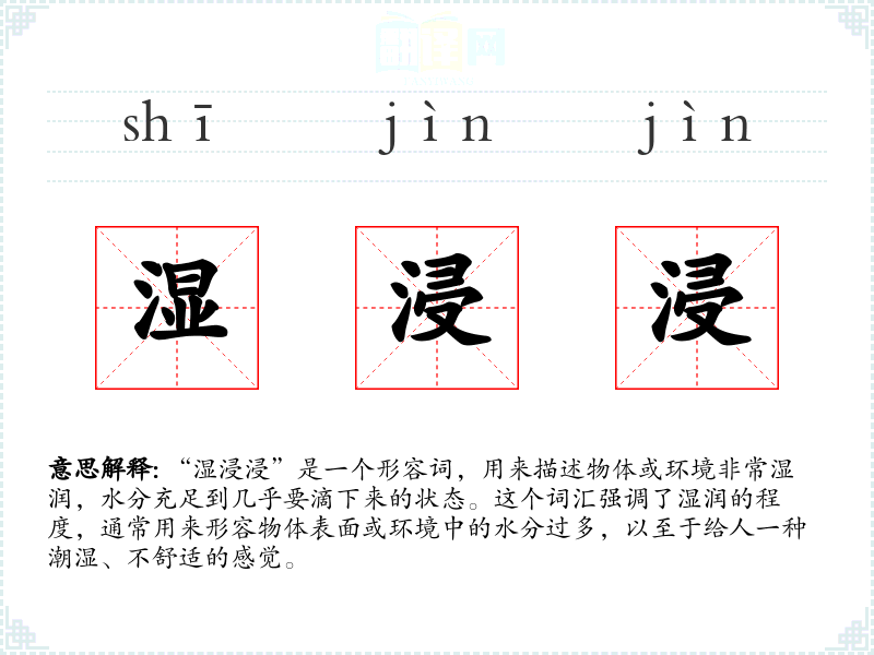 “湿浸浸”是一个形容词,用来描述物体或环境非常湿润,水分充足到几乎要滴下来的状态。这个词汇强调了湿润的程度,通常用来形容物体表面或环境中的水分过多,以至于给人一种潮湿、不舒适的感觉。
