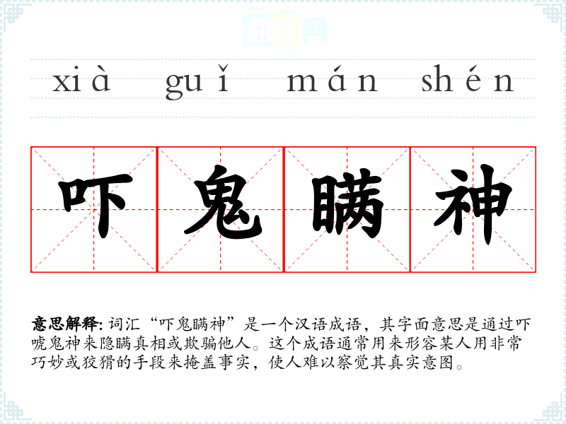 “吓鬼瞒神”这个成语的字面意思是吓唬鬼神,但实际上是用来形容人用极其巧妙或狡猾的手段来掩盖真相,使人难以识破。