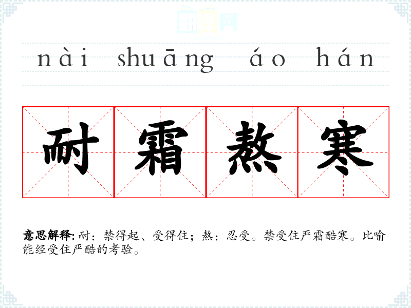 耐:禁得起、受得住;熬:忍受。禁受住严霜酷寒。比喻能经受住严酷的考验。