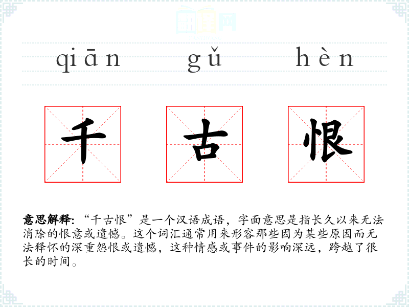 “千古恨”是一个汉语成语,字面意思是指长久以来无法消除的恨意或遗憾。这个词汇通常用来形容那些因为某些原因而无法释怀的深重怨恨或遗憾,这种情感或**的影响深远,跨越了很长的时间。