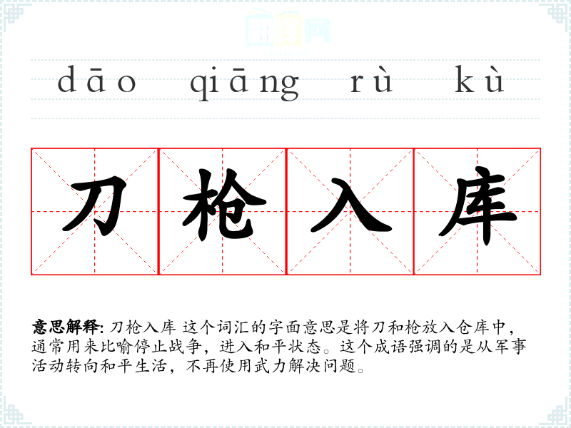 刀枪入库 这个词汇的字面意思是将刀和枪放入仓库中,通常用来比喻停止战争,进入和平状态。这个成语强调的是从军事活动转向和平生活,不再使用武力解决问题。