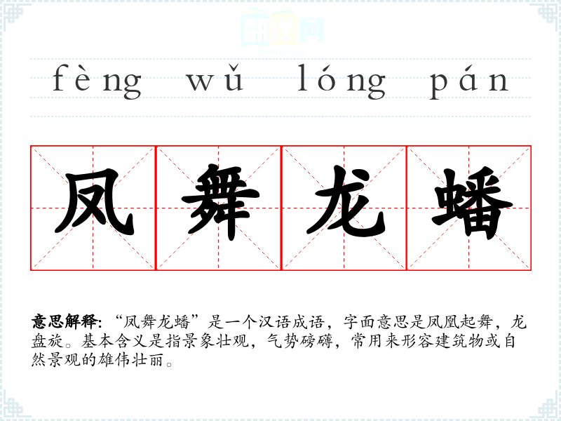 “凤舞龙蟠”是一个汉语成语,字面意思是凤凰起舞,龙盘旋。基本含义是指景象壮观,气势磅礴,常用来形容建筑物或自然景观的雄伟壮丽。