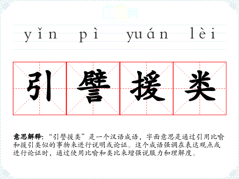 “引譬援类”是一个汉语成语,字面意思是通过引用比喻和援引类似的事物来进行说明或论证。这个成语强调在表达观点或进行论证时,通过使用比喻和类比来增强说服力和理解度。