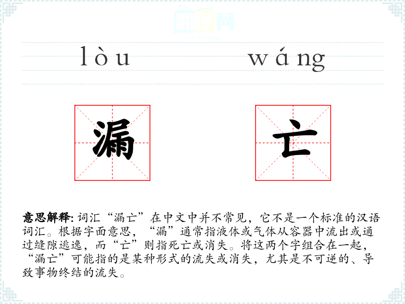 词汇“漏亡”在中文中并不常见,它不是一个标准的汉语词汇。根据字面意思,“漏”通常指液体或气体从容器中流出或通过缝隙逃逸,而“亡”则指死亡或消失。将这两个字组合在一起,“漏亡”可能指的是某种形式的流失或消失,尤其是不可逆的、导致事物终结的流失。