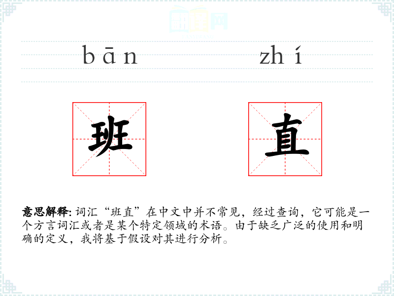 词汇“班直”在中文中并不常见,经过查询,它可能是一个方言词汇或者是某个特定领域的术语。由于缺乏广泛的使用和明确的定义,我将基于假设对其进行分析。