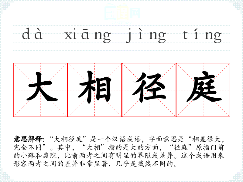 “大相径庭”是一个汉语成语,字面意思是“相差很大,完全不同”。其中,“大相”指的是大的方面,“径庭”原指门前的小路和庭院,比喻两者之间有明显的界限或差异。这个成语用来形容两者之间的差异非常显著,几乎是截然不同的。