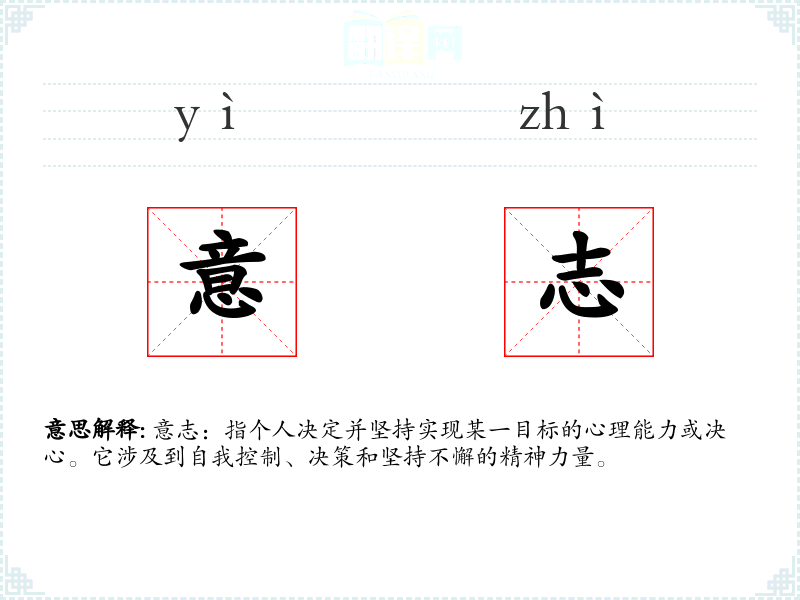 - 中文:“意志”在中文中与“决心”和“毅力”相近。