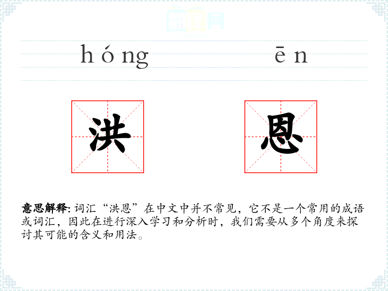 “洪恩”字面意思可以理解为“巨大的恩惠”或“深厚的恩情”。其中,“洪”通常指大、广、深,而“恩”则指恩惠、恩情。