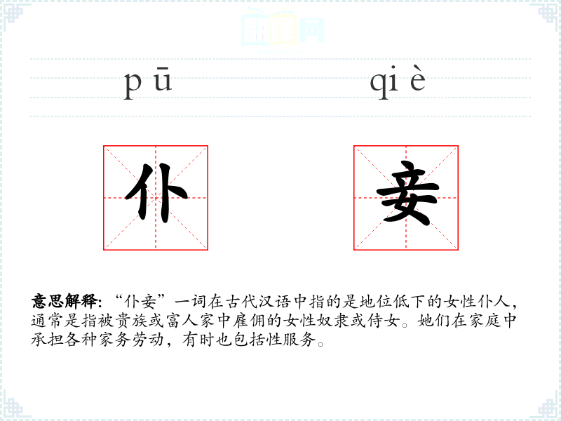 “仆妾”这个词虽然现代使用较少,但它承载了丰富的历史和文化信息,对于理解古代社会的结构和人们的生活状态具有重要意义。在语言学*和表达中,了解这样的词汇可以帮助我们更深入地理解历史和文化。