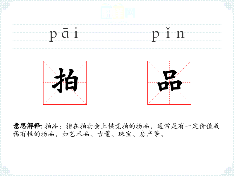 拍品:指在拍卖会上供竞拍的物品,通常是有一定价值或稀有性的物品,如艺术品、古董、珠宝、房产等。