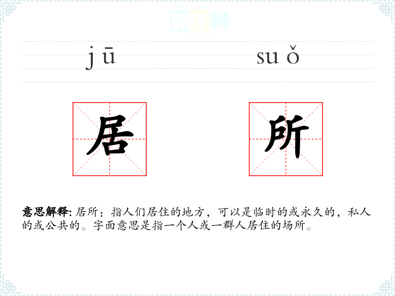 居所:指人们居住的地方,可以是临时的或永久的,私人的或公共的。字面意思是指一个人或一群人居住的场所。