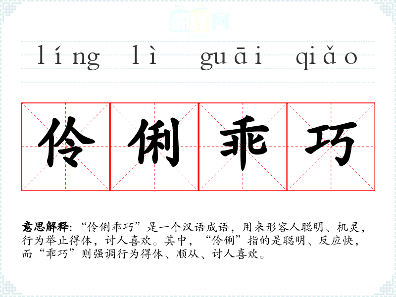 “伶俐乖巧”是一个汉语成语,用来形容人聪明、机灵,行为举止得体,讨人喜欢。其中,“伶俐”指的是聪明、反应快,而“乖巧”则强调行为得体、顺从、讨人喜欢。