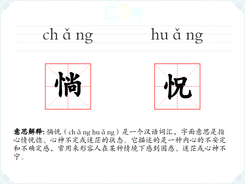 惝恍(chǎng huǎng)是一个汉语词汇,字面意思是指心情恍惚、心神不定或迷茫的状态。它描述的是一种内心的不安定和不确定感,常用来形容人在某种情境下感到困惑、迷茫或心神不宁。