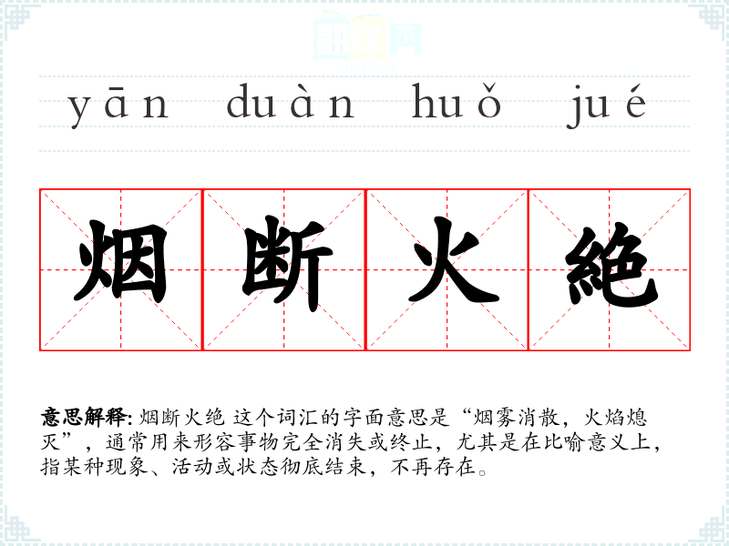 烟断火绝 这个词汇的字面意思是“烟雾消散,火焰熄灭”,通常用来形容事物完全消失或终止,尤其是在比喻意义上,指某种现象、活动或状态彻底结束,不再存在。