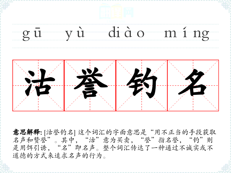 [沽誉钓名] 这个词汇的字面意思是“用不正当的手段获取名声和赞誉”。其中,“沽”意为买卖,“誉”指名誉,“钓”则是用饵引诱,“名”即名声。整个词汇传达了一种通过不诚实或不道德的方式来追求名声的行为。