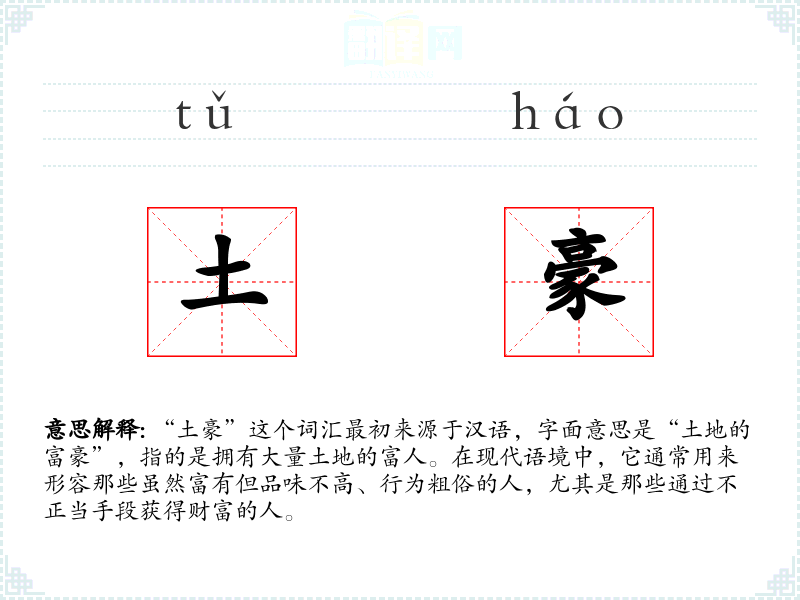 “土豪”这个词汇最初来源于汉语,字面意思是“土地的富豪”,指的是拥有大量土地的富人。在现代语境中,它通常用来形容那些虽然富有但品味不高、行为粗俗的人,尤其是那些通过不正当手段获得财富的人。