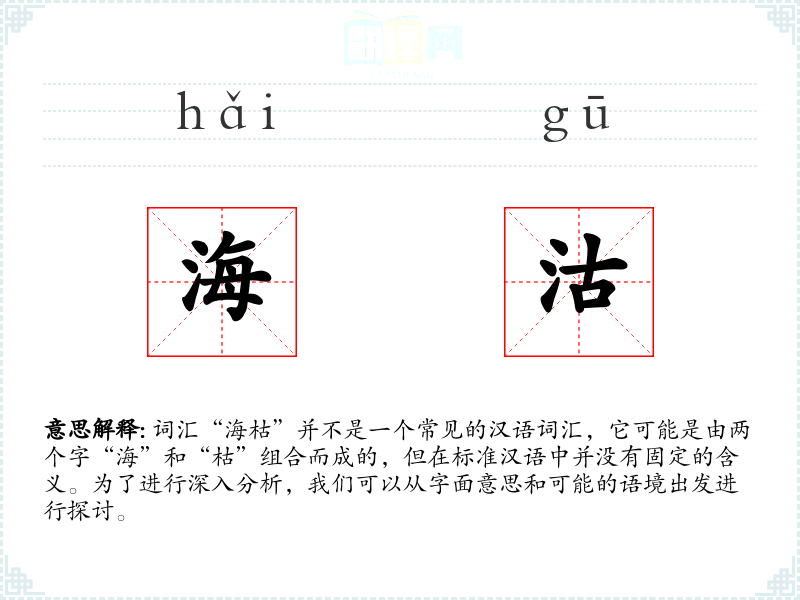 词汇“海枯”并不是一个常见的汉语词汇,它可能是由两个字“海”和“枯”组合而成的,但在标准汉语中并没有固定的含义。为了进行深入分析,我们可以从字面意思和可能的语境出发进行探讨。