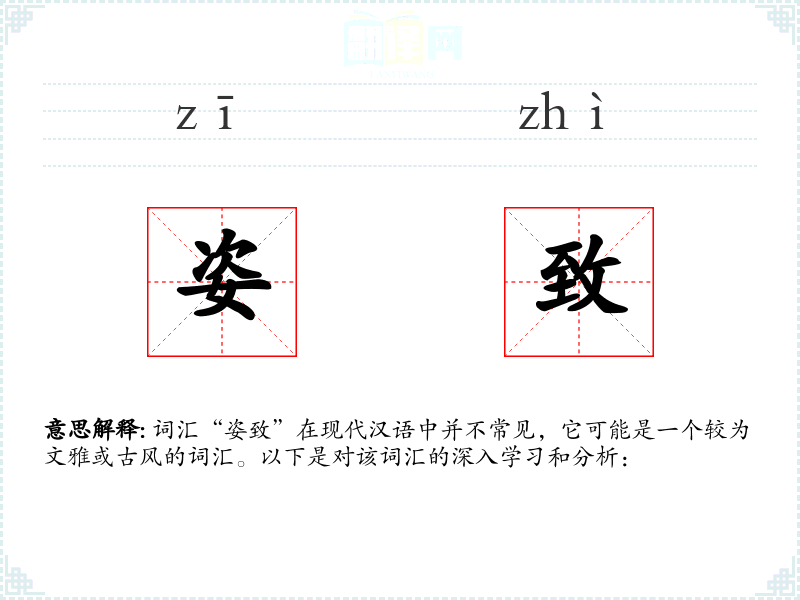 词汇“姿致”在现代汉语中并不常见,它可能是一个较为文雅或古风的词汇。以下是对该词汇的深入学*和分析: