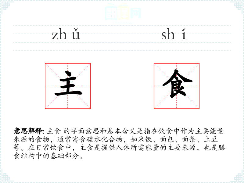 - 口语:在日常对话中,主食是一个常用词汇,用来描述日常饮食的主要组成部分,如“今天的晚餐有什么主食?”