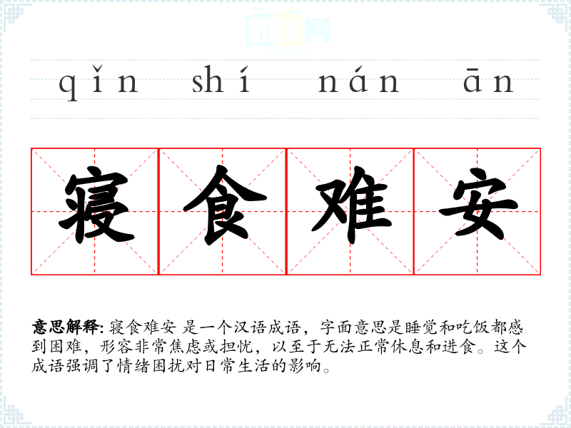 寝食难安 是一个汉语成语,字面意思是睡觉和吃饭都感到困难,形容非常焦虑或担忧,以至于无法正常休息和进食。这个成语强调了情绪困扰对日常生活的影响。