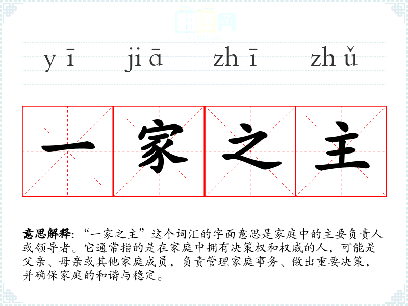 “一家之主”这个词汇的字面意思是家庭中的主要负责人或领导者。它通常指的是在家庭中拥有决策权和权威的人,可能是父亲、母亲或其他家庭成员,负责管理家庭事务、做出重要决策,并确保家庭的和谐与稳定。