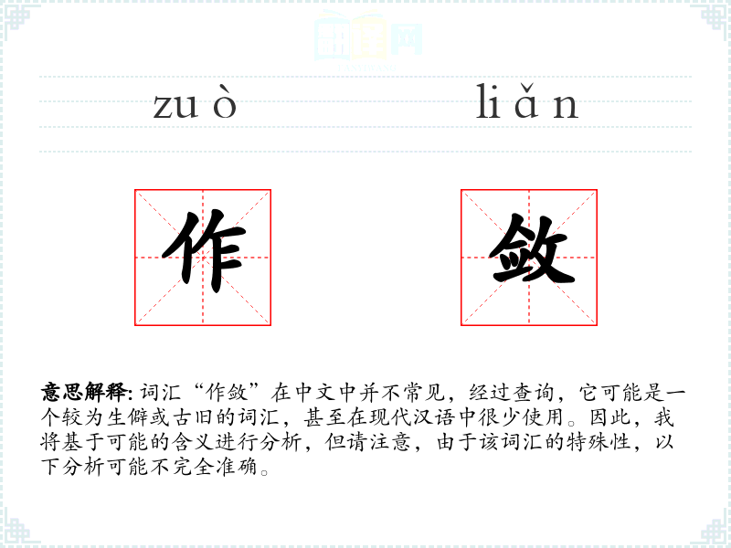 词汇“作敛”在中文中并不常见,经过查询,它可能是一个较为生僻或古旧的词汇,甚至在现代汉语中很少使用。因此,我将基于可能的含义进行分析,但请注意,由于该词汇的特殊性,以下分析可能不完全准确。