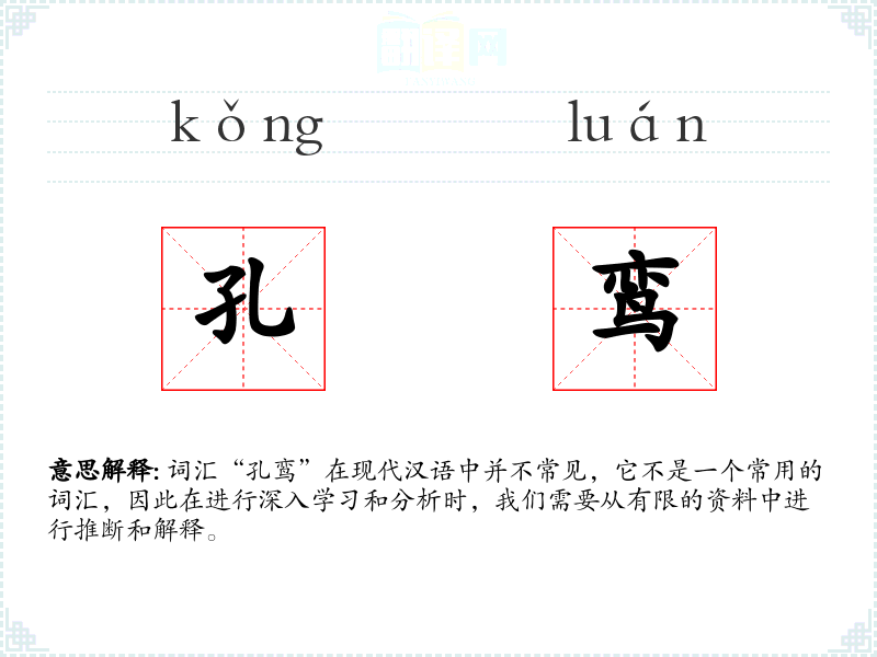 词汇“孔鸾”在现代汉语中并不常见,它不是一个常用的词汇,因此在进行深入学*和分析时,我们需要从有限的资料中进行推断和解释。