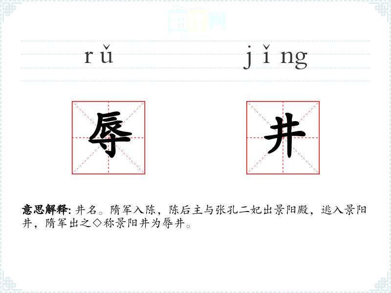 井名。隋军入陈,陈后主与张孔二妃出景阳殿,逃入景阳井,隋军出之◇称景阳井为辱井。