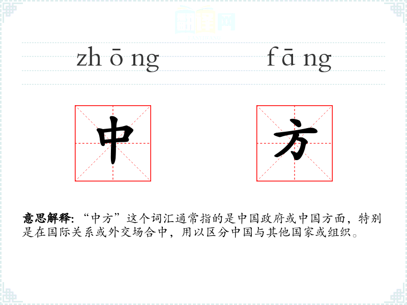 “中方”这个词汇通常指的是政府或方面,特别是在国际关系或外交场合中,用以区分**与其他国家或组织。