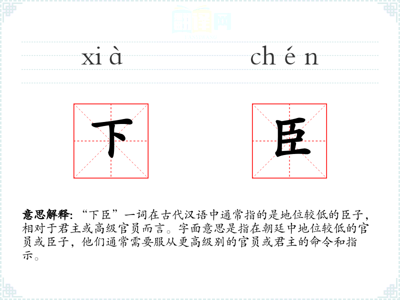 “下臣”一词在古代汉语中通常指的是地位较低的臣子,相对于君主或高级官员而言。字面意思是指在朝廷中地位较低的官员或臣子,他们通常需要服从更高级别的官员或君主的命令和指示。