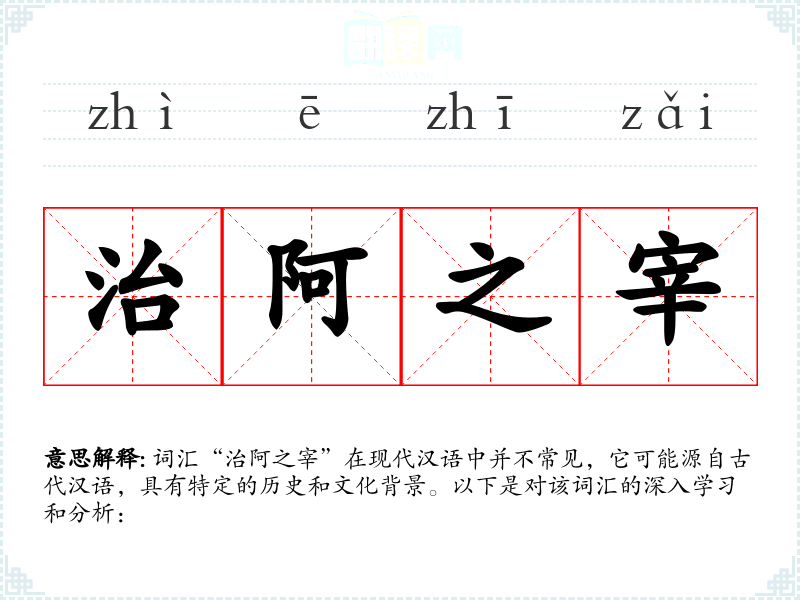 词汇“治阿之宰”在现代汉语中并不常见,它可能源自古代汉语,具有特定的历史和文化背景。以下是对该词汇的深入学*和分析:
