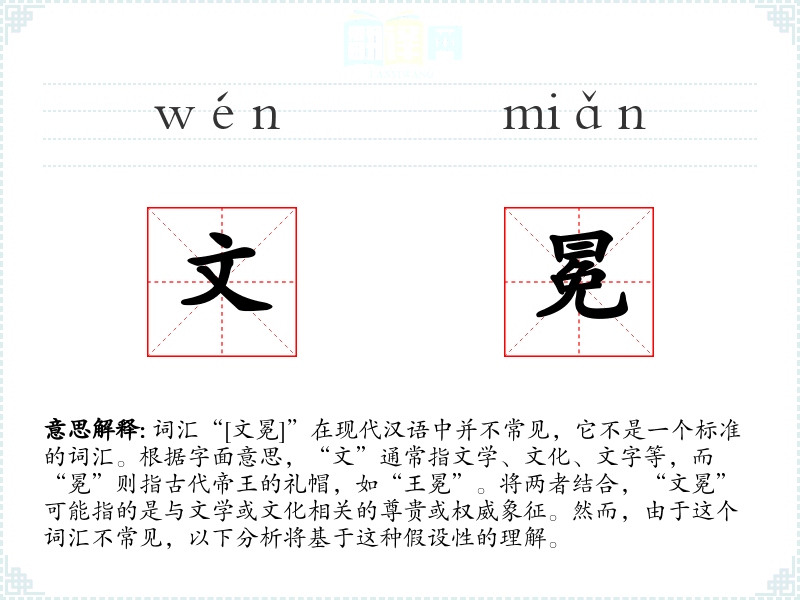 词汇“[文冕]”在现代汉语中并不常见,它不是一个标准的词汇。根据字面意思,“文”通常指文学、文化、文字等,而“冕”则指古代帝王的礼帽,如“王冕”。将两者结合,“文冕”可能指的是与文学或文化相关的尊贵或权威象征。然而,由于这个词汇不常见,以下分析将基于这种假设性的理解。