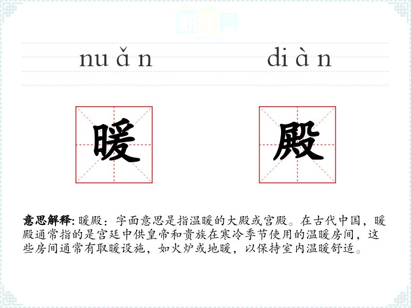 暖殿:字面意思是指温暖的大殿或宫殿。在古代,暖殿通常指的是宫廷中供和贵族在寒冷季节使用的温暖房间,这些房间通常有取暖设施,如火炉或地暖,以保持室内温暖舒适。