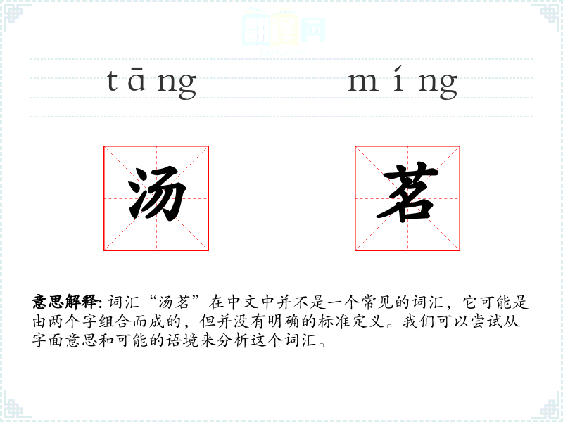 词汇“汤茗”在中文中并不是一个常见的词汇,它可能是由两个字组合而成的,但并没有明确的标准定义。我们可以尝试从字面意思和可能的语境来分析这个词汇。