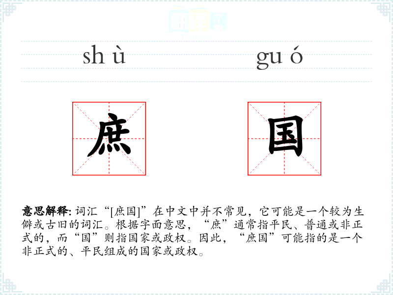 词汇“[庶国]”在中文中并不常见,它可能是一个较为生僻或古旧的词汇。根据字面意思,“庶”通常指平民、普通或非正式的,而“国”则指国家或政权。因此,“庶国”可能指的是一个非正式的、平民组成的国家或政权。