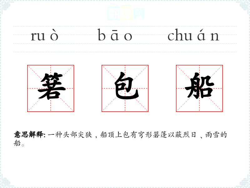 一种头部尖狭﹐船顶上包有穹形箬篷以蔽烈日﹑雨雪的船。