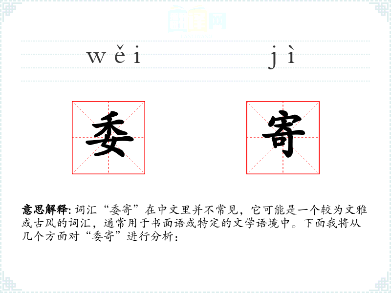 词汇“委寄”在中文里并不常见,它可能是一个较为文雅或古风的词汇,通常用于书面语或特定的文学语境中。下面我将从几个方面对“委寄”进行分析: