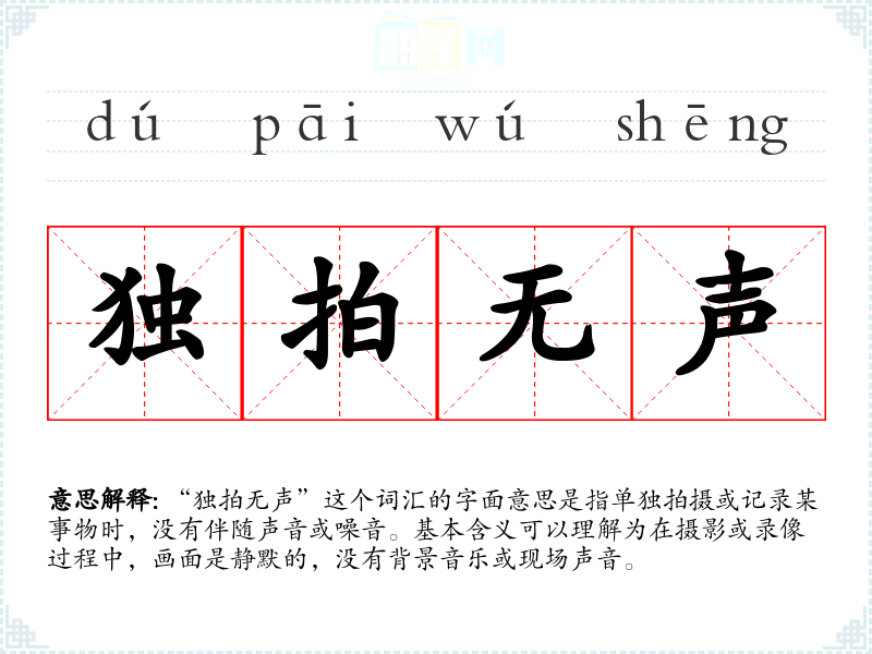 “独拍无声”这个词汇可能是现代汉语中新创造的词汇,结合了“独拍”(单独拍摄)和“无声”(没有声音)的概念。在摄影和电影技术的发展中,随着对画面和声音分离处理的需求增加,这个词汇逐渐被广泛使用。