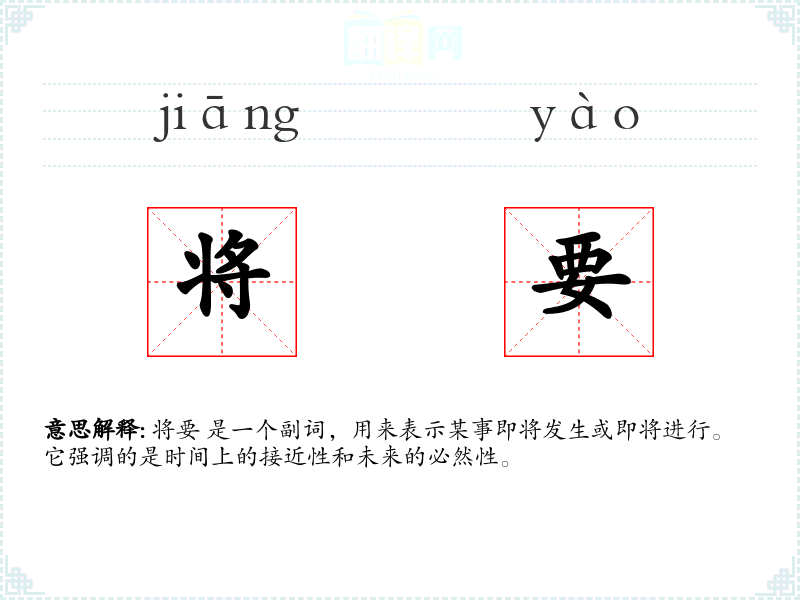 “将要”源自古代汉语,由“将”和“要”两个字组成,“将”有接近、即将的意思,“要”表示需求或意愿。在现代汉语中,“将要”作为一个固定搭配,表示未来的动作或状态。